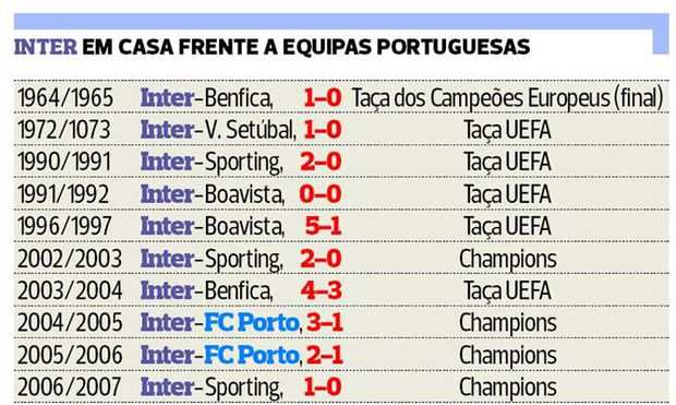 Um empate, como aquele que o Boavista de Manuel José alcançou a 2 de outubro de 1991, na Taça UEFA, numa 2.ª mão épica que permitiu aos axadrezados eliminar o colosso italiano (venceram 2-1 no Bessa), não cairia mal. No geral, em casa e fora, o Inter de Milão soma 10 vitórias, 5 empates e quatro derrotas contra equipas lusas. Em Milão, é bem mais demolidor e a história começou num jogo de fraca memória para os benfiquistas, a final da Taça dos Campeões Europeu, a 27 de maio de 1965, disputada em San Siro, num autêntico lamaçal e decidida a favor dos italianos depois de um frango de Costa Pereira, que deixou escapar a bola rematada por Jair.