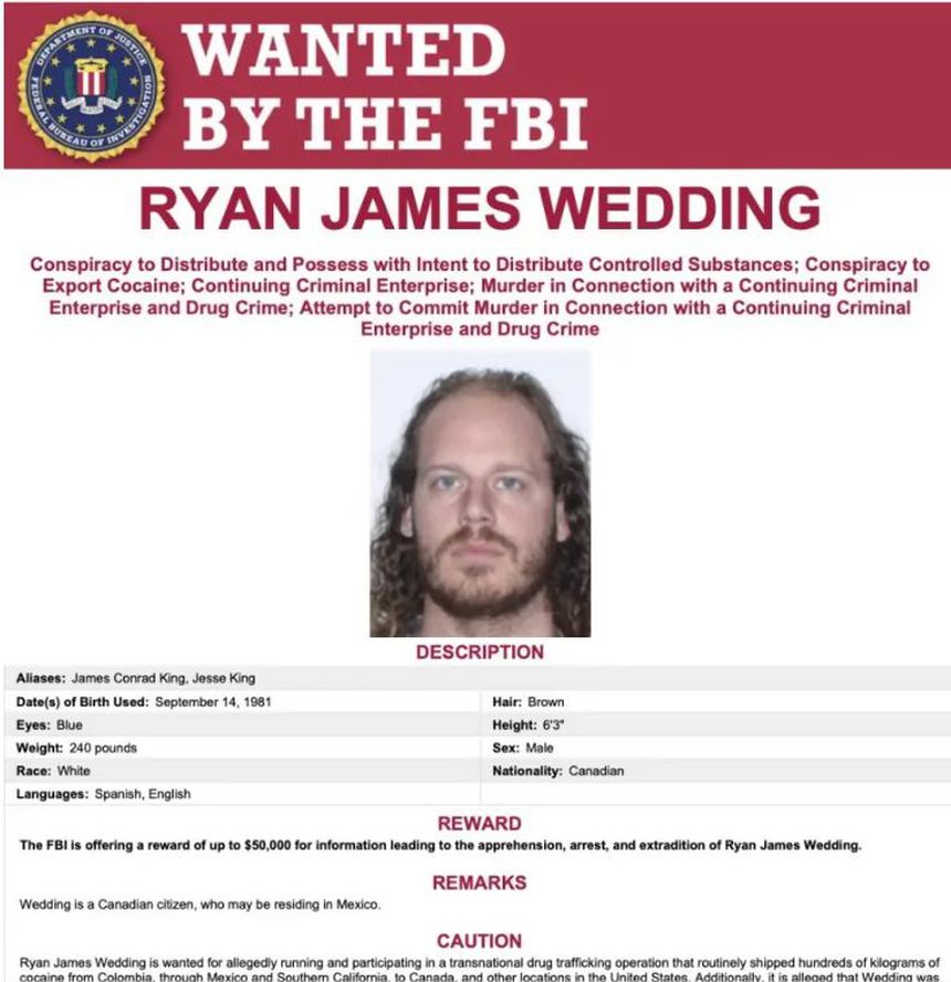 O FBI afirma que Wedding, conhecido pelas alcunhas ‘El Jefe’, ‘Gigante’ ou ‘Enemigo Publico’, é procurado por alegadamente ter «dirigido e participado numa operação de tráfico de droga que enviava regularmente centenas de quilos de cocaína da Colômbia, através do México e do Sul da Califórnia, para o Canadá e Estados Unidos», além de «múltiplos assassinatos em prol destes crimes relacionados com o tráfico.
