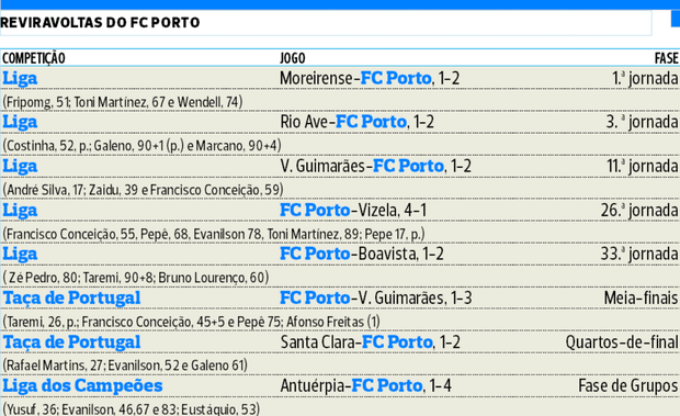 Feito o balanço dos ganhos e prejuízos, é óbvio que as cinco reviravoltas operadas esta temporada pelos portistas no campeonato evitaram uma queda ainda mais abrupta na classificação. Por outro lado, e como o treinador tantas vezes alertou, os tiros dados nos pés pelo FC Porto e a incapacidade de traduzir em golos as oportunidades criadas levou ao quadro atual. O risco de igualar o 4.º lugar de 1975/76, com Mário da Costa no comando, existe, ainda que baste aos azuis e brancos um empate frente ao SC Braga para assegurar o terceiro posto que agora ocupam. Moreirense-FC Porto, 1-2, na 1.ª jornada), Rio Ave-FC Porto, 1-2 (3.ª), V. Guimarães-FC Porto, 1-2 (11.ª), FC Porto-Vizela, 4-1 (26.ª) e FC Porto-Boavista, 1-2 (33.ª) foram as reviravoltas do FC Porto na Liga. Houve outras três nesta temporada, contra o Santa Clara e V. Guimarães, na Taça da Portugal, e frente ao Antuérpia, fora, na fase de grupos da Champions.