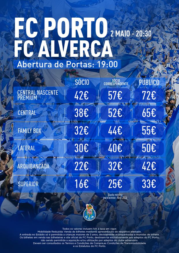 O FC Porto informou hoje que já estão disponíveis os bilhetes para a receção ao FC Alverca, em partida a contar para a 32.ª jornada da Liga Portugal. O encontro está marcado para o próximo dia 2 de maio, um sábado, com início às 20h30 no Estádio do Dragão e terá transmissão televisiva na Sport TV.