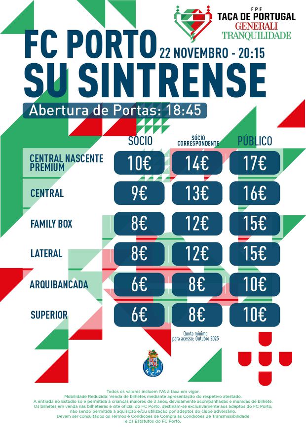 O FC Porto colocou hoje à venda os bilhetes para o jogo com o Sintrense, embate da quarta eliminatória da Taça de Portugal, que está agendado para as 20h15 do dia 22, sábado, no Estádio do Dragão (RTP1).