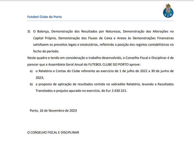 Os associados do FC Porto vão poder votar o documento na Assembleia Geral Ordinária marcada para o próximo dia 29 de novembro, no Dragão Arena.