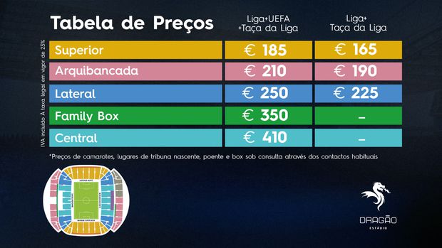Os adeptos que estejam interessados em adquirir o seu lugar anual no Estádio do Dragão terão à sua disposição duas modalidades: o pack 'Liga + Taça da Liga + UEFA' - 17 jogos da Liga, um jogo dos quartos de final da Taça da Liga, quatro jogos da fase de grupos da Liga Europa e também o jogo de apresentação aos sócios e adeptos - e o pack 'Liga + Taça da Liga' - 17 jogos da Liga, um jogo dos quartos de final da Taça da Liga e jogo de apresentação (esta opção, acrescente-se, estará apenas disponível nas bancadas Superior, Arquibancada e Lateral). Os preços variam entre os 165 e os 410 euros.