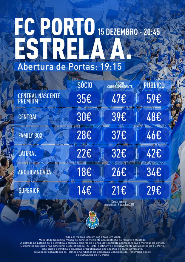 O FC Porto já colocou à venda os bilhetes para o jogo com o Estrela da Amadora, referente à 14.ª jornada da Liga Portugal e que está agendado para as 20h45 do próximo dia 15 de dezembro, uma segunda-feira, no Estádio do Dragão (Sport TV).