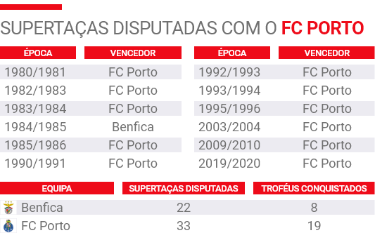 No confronto direto entre águias e dragões, a equipa lisboeta tem enfrentado claras dificuldades para ultrapassar os homens do norte também nesta competição. Em 12 troféus discutidos entre os dois, apenas por uma vez a taça foi parar ao museu encarnado, referente à época 1984/85.