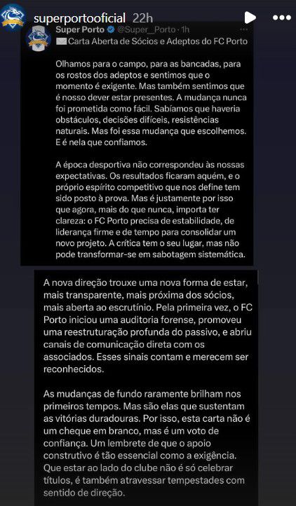 Reconhecendo que a época desportiva ficou aquém das expectativas e o espírito competitivo foi desafiado, aquela comunidade entende que o FC Porto precisa de estabilidade, liderança firme e tempo para consolidar o novo projeto. Para a comunidade Super Porto, o atual elenco trouxe mudanças significativas: maior transparência, proximidade com os sócios, auditoria forense e reestruturação do passivo. A nova direção trouxe uma nova forma de estar, mais transparente, mais próxima dos sócios, mais aberta ao escrutínio.