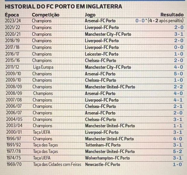 Não houve, portanto, motivos para festejos das 23 deslocações dos dragões a terras de Sua Majestade para duelos com ingleses, exceção feita a três empates, um deles de boa memória, em 2003/2004, na caminhada que redundou na conquista da Champions, com os portistas a alcançarem uma igualdade a uma bola em Old Trafford, graças a um tento nos instantes finais de Costinha, que motivou a famosa corrida desenfreada de José Mourinho para festejar com jogadores e staff perante o silêncio do Teatro dos Sonhos.
