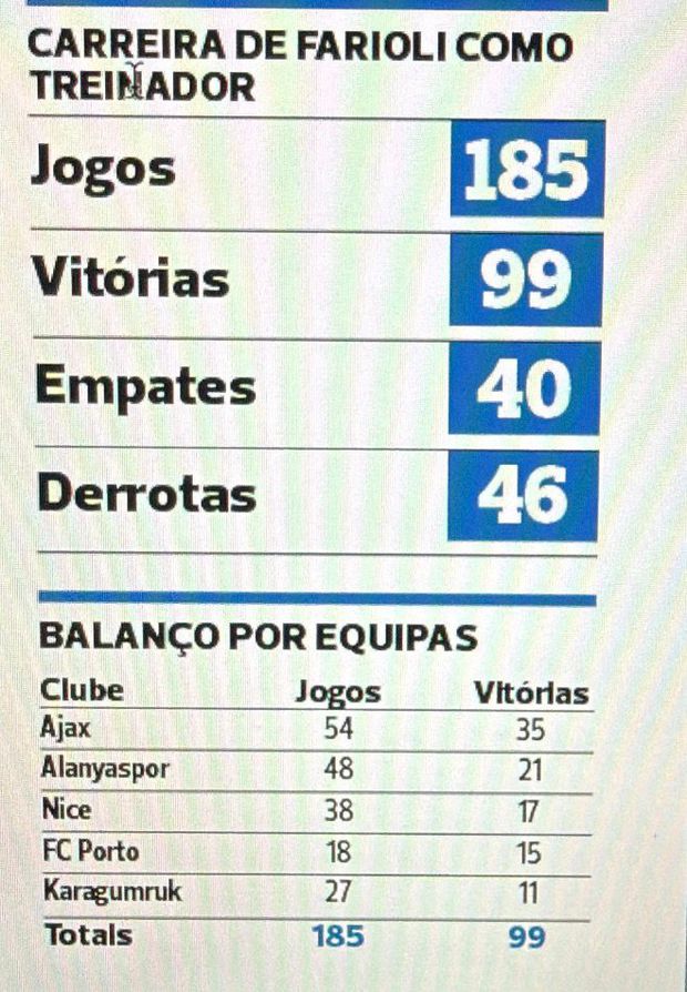 Neste momento, o técnico portista tem uma percentagem impressionante de 83,3 por cento de triunfos no emblema da cidade invicta. Na sua trajetória profissional, Francesco Farioli contabiliza um total de 185 partidas como timoneiro, divididas por Karagumruk, Alanyaspor, Nice, Ajax e FC Porto, tendo neste percurso alcançado 99 vitórias, 40 empates e 46 derrotas. Chegou ao Dragão e gerou enorme expectativa, sabe que a fasquia do título português esta demasiada alto, mas no primeiro terço do campeonato tem dado provas inequívocas de profissionalismo. E este fim de semana pode e quer atingir a centena de vitórias com o Estoril.