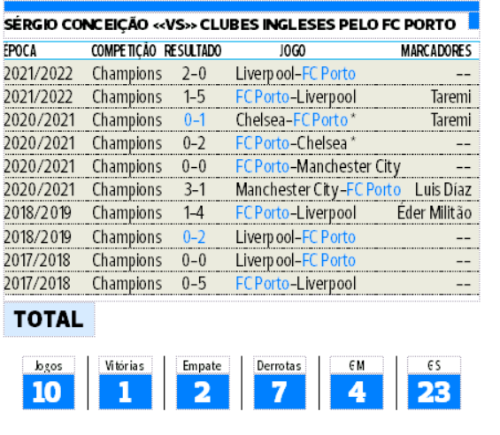 Se num passado recente o treinador do FC Porto já deu várias provas da sua competência profissional, ao eliminar Juventus, Roma e a Lazio de Roma, a verdade é que nos duelos contra equipas de Inglaterra o desempenho dos dragões não tem sido positivo, em especial no Estádio do Dragão, onde Sérgio Conceição nunca conseguiu vencer nenhum adversário da ilha britânica. É, portanto, um enorme desafio aquele que se avizinha para os azuis e brancos, que na memória têm sem dúvidas as eliminatórias a eliminar da Champions com o Liverpool — três goleadas em temporadas diferentes —, mas Sérgio Conceição já conseguiu neste reinado de sete anos ao serviço do clube do coração surpreender em várias circunstâncias.