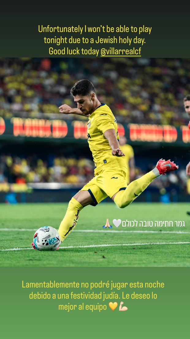 Manor Solomon anunciou, no dia do encontro do Villarreal com a Juventus, que não poderá representar o submarino amarelo na 2.ª jornada da Champions League devido à celebração do Yom Kipur, o feriado mais sagrado da religião judaica.