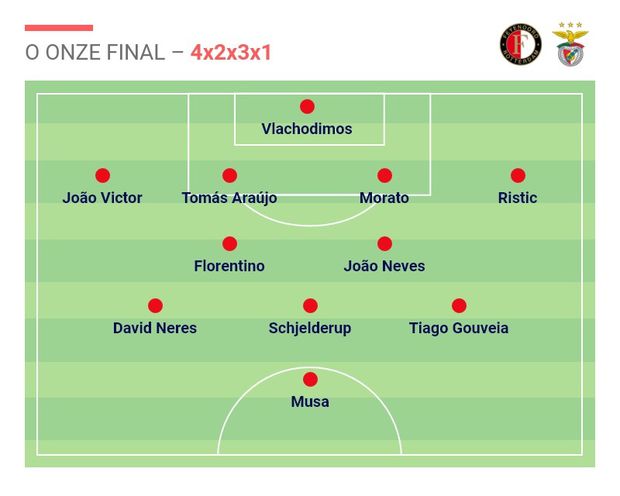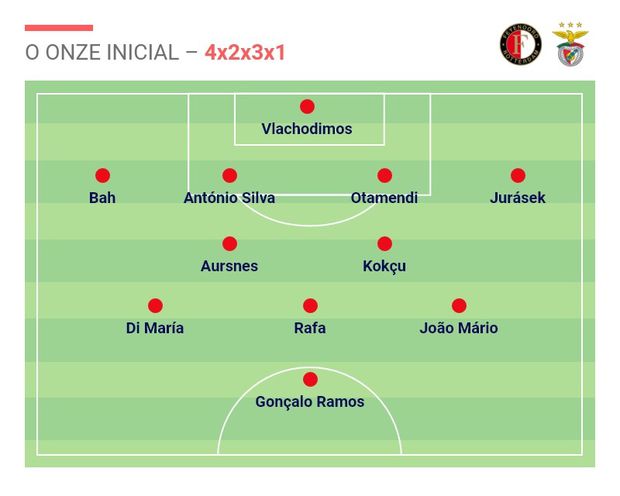 Ao contrário dos outros cinco jogos, Schmidt não mudou onze jogadores ao intervalo. Fez apenas três alterações mas a tendência manteve-se: o Feyenoord sempre mais perto do 3-0 porque jogava no meio-campo do Benfica, algo que mudou ligeiramente com Florentino (é mesmo preciso ter alguém que defenda naquela zona) e João Neves.