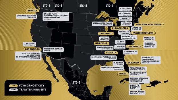 De acordo com a FIFA, os 32 clubes finalistas vão distribuir-se por 14 dos estados do país. A Florida, com nove clubes, entre os quais o Benfica, foi o mais procurado, seguido da California (5) e de New Jersey (4, incluindo o FC Porto).