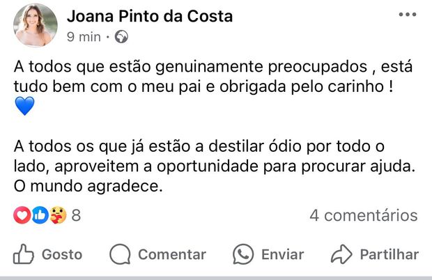 «A todos que estão genuinamente preocupados, está tudo bem com o meu pai e obrigada pelo carinho! A todos os que já estão a destilar ódio por todo o lado, aproveitem a oportunidade para procurar ajuda. O mundo agradece», escreveu, nas redes sociais.