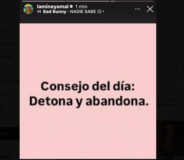O número 10 dos blaugrana publicou, esta segunda-feira, uma imagem enigmática nas stories daquela rede social, em que pode ler-se: «Conselho do dia: detona e abandona.» A mensagem é acompanhada pela música Nadie Sabe, de Bad Bunny.