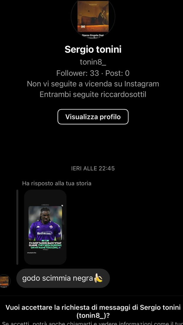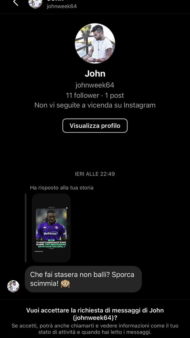 Depois da derrota da Fiorentina na visita ao Inter, por 2-1, na Serie A, o jogador da Fiorentina Moise Kean foi alvo de insultos racistas nas suas redes sociais. O avançado italiano partilhou os prints das mensagens e mudou a sua foto de perfil para uma foto de um gorila, em tom de resposta aos insultos que recebeu.