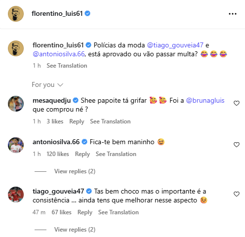 Florentino Luís publicou duas fotos do estilo de roupa escolhido para um dia de treino no Benfica e meteu ao barulho António Silva e Tiago Gouveia. O defesa central e o extremo direito recuperaram o papel de polícias da moda, que desempenharam num vídeo publicado pelo Benfica há uma semana e analisaram a indumentária do médio defensivo.