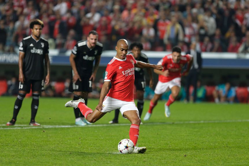 Na imagem original é possível ver-se o marcador, João Mário, festejando com os companheiros Gonçalo Ramos, Enzo Fernández, Rafa, Bah e Florentino.