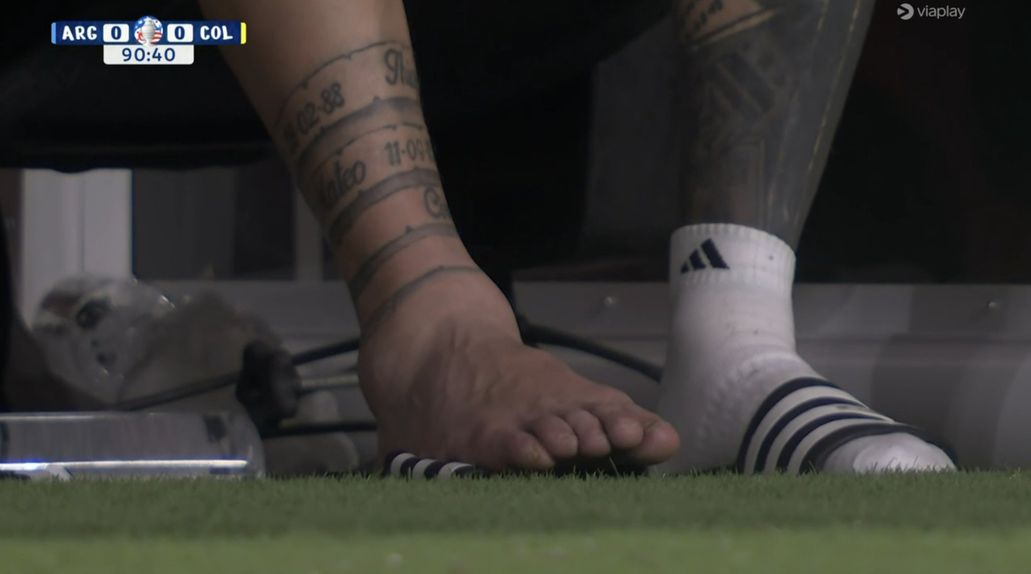 Transmissão televisiva mostra o pé direito descalço do avançado argentino