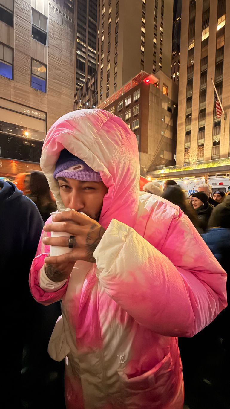 De férias em Nova Iorque, Neymar apostou num visual vistoso mas que lhe garantiu privacidade num dos locais mais cheios de gente no mundo: Times Square, em Nova Iorque.