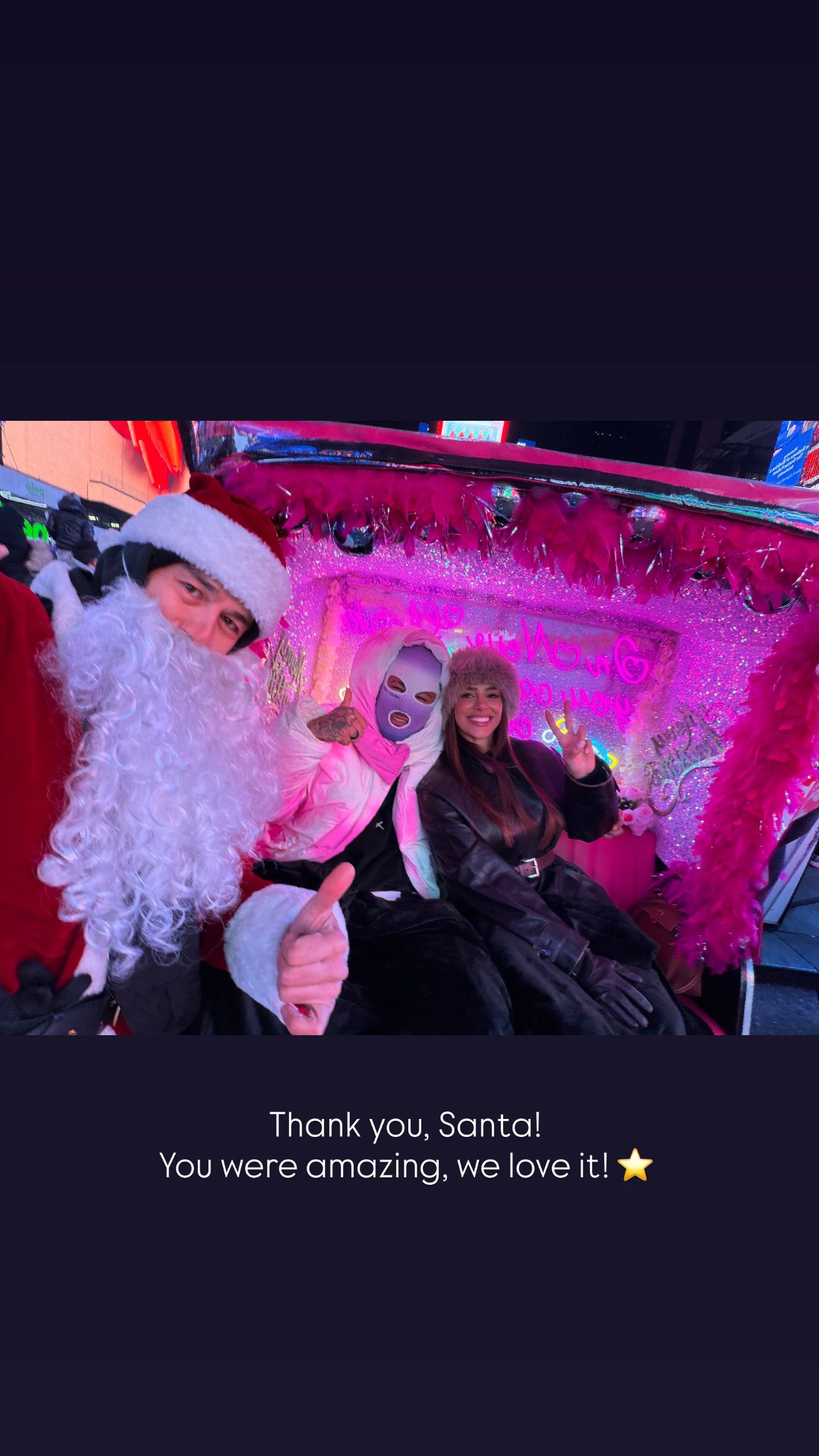 Um casaco da Louis Vuitton, branco e rosa, com o capuz, foi completado com uma balaclava lilás que lhe cobria o rosto.