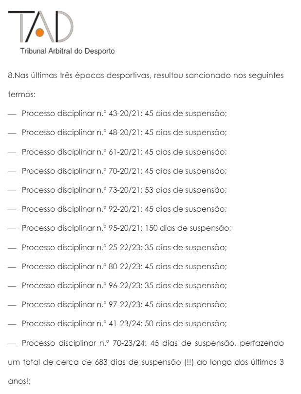 «O Demandante [Francisco J. Marques] tem vindo a sofrer consecutivas condenações à ordem dos inúmeros processos que, por alegada lesão da honra e consideração de agentes desportivos (arts. 136.º-1 e 3, e 112.º-1 do RD), contra si vêm sendo levantados pelo Conselho de Disciplina da FPF; têm sido aplicadas sucessivas e longas suspensões com o manifesto resultado de o silenciar – o que, na verdade, mais não traduz do que uma inadmissível forma de bullying jurídico», apontando «um total de cerca de 683 dias de suspensão (!!) ao longo dos últimos 3 anos!», lê-se no acórdão da decisão arbitral.