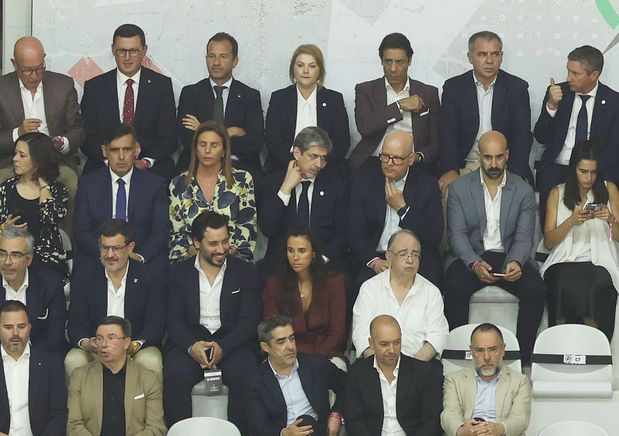 Frederico Varandas e Rui Costa estão acompanhados por Helena Pires, CEO da FPF, de Pedro Dias, secretário de Estado do Desporto, e Luciano Gonçalves, presidente do Conselho de Arbitragem, entre outras figuras do panorama desportivo nacional.