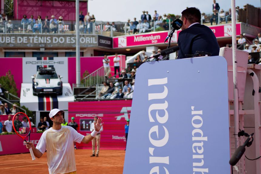 Nem Cristian Garin percebe bem o que aconteceu na jogada que marcou o encontro com Nuno Borges, nesta sexta-feira, nos quartos de final do Estoril Open.