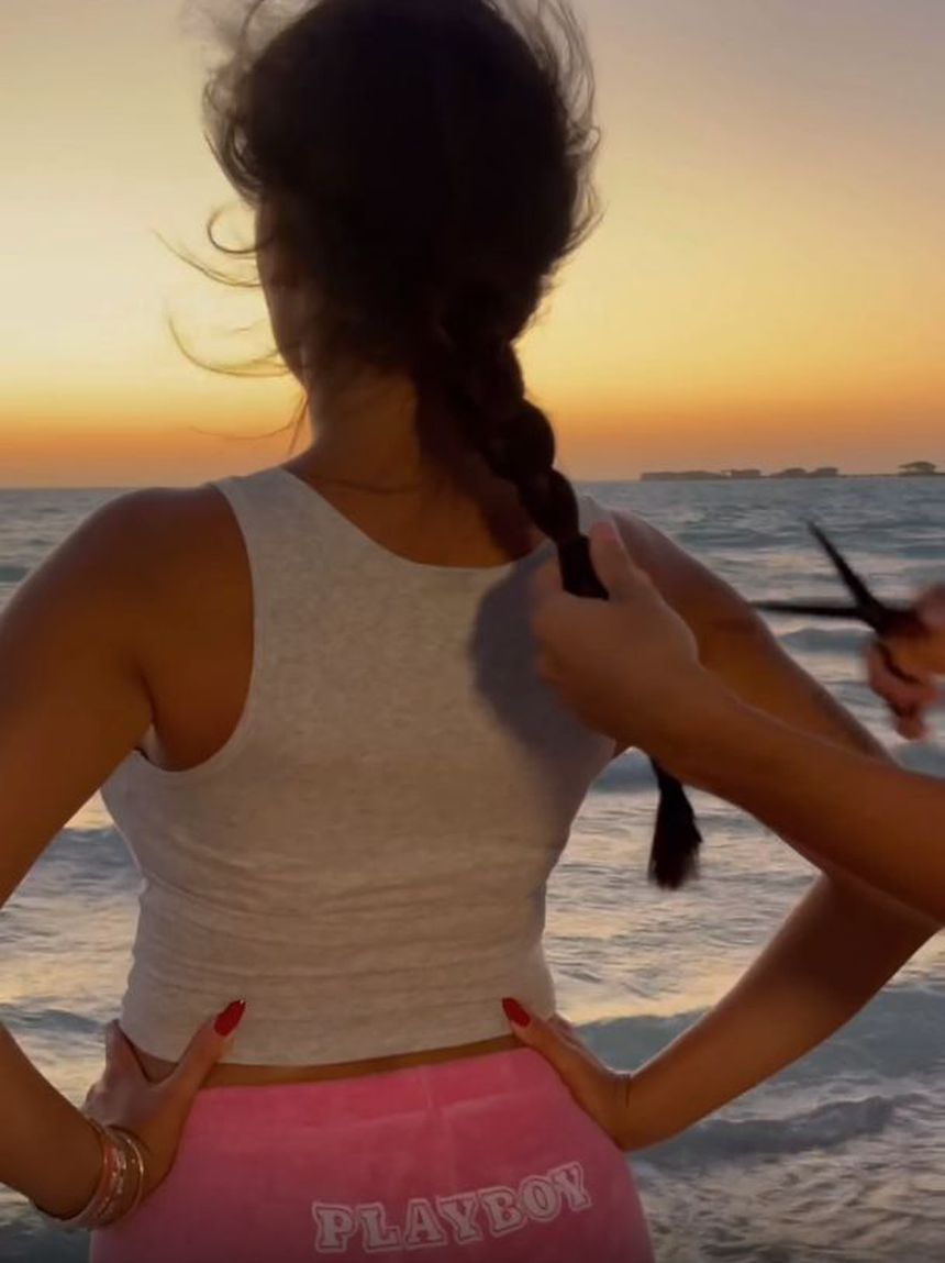 A espanhola mostra-se à beira de água e alguém não identificado corta-lhe parte do cabelo, apanhado em trança.