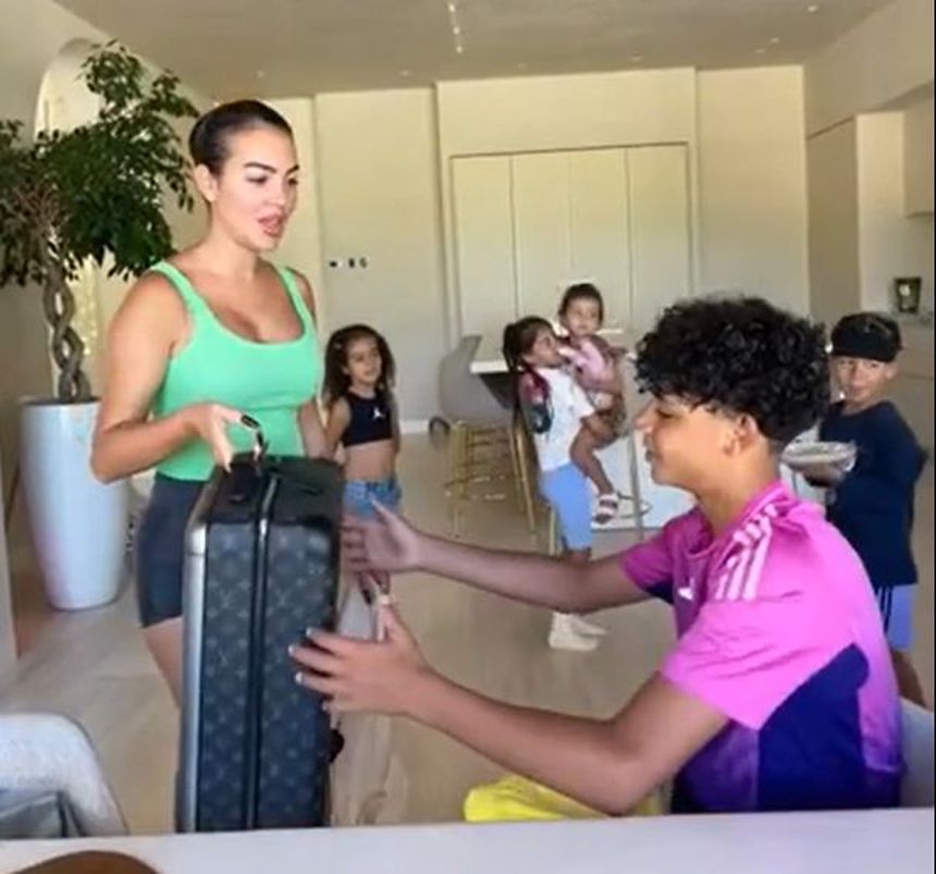 No momento partilhado por Georgina, Cristianinho aparece em casa com os irmãos e abre as prendas, uma delas é uma mala de viagem da Louis Vuitton.