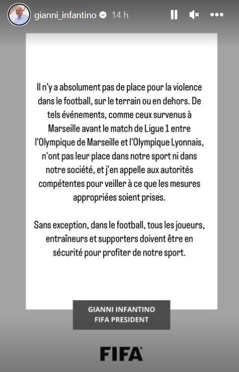«Não há espaço absolutamente algum para a violência no futebol, no campo ou fora dele. Tais situações, como aquela que aconteceu em Marselha antes do jogo da Ligue 1 entre Marselha e Lyon, não têm lugar no nosso desporto nem na nossa sociedade e apelo às autoridades competentes que garantam medidas adequadas», afirmou o presidente da FIFA nas redes sociais.