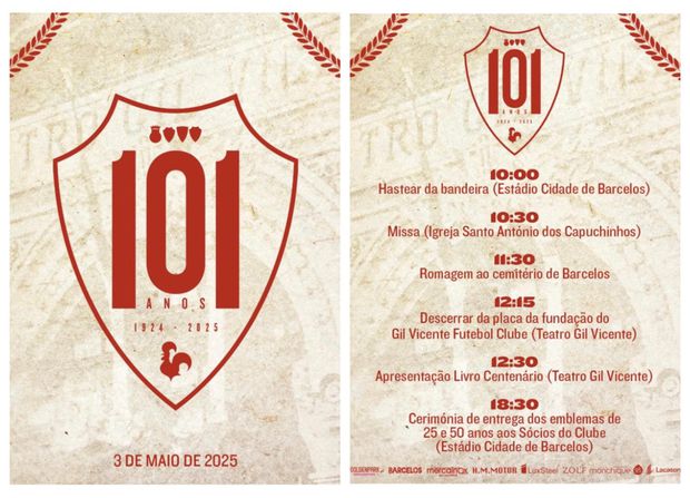O Gil Vicente anunciou, esta terça-feira, o programa das celebrações do 101.º aniversário do clube, assinalado a 3 de maio, vésperas da deslocação a Alvalade, para defrontar o Sporting na 32.ª jornada da Liga, do qual se destaca o lançamento do livro do centenário e ainda o descerramento da placa no local de fundação do emblema de Barcelos, mesmo junto ao Teatro Gil Vicente.