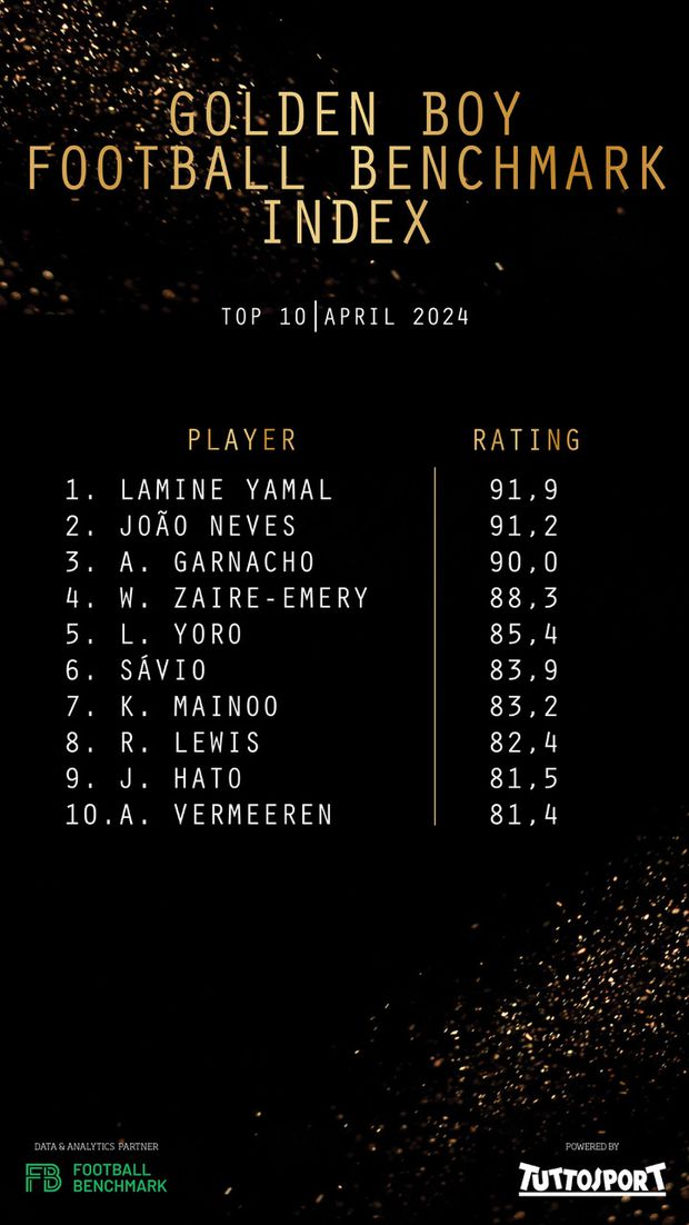 O ranking, refira-se, baseia-se no desempenho em campo dos jogadores desde outubro de 2023. Os futebolistas têm em 2004 ou depois e devem pertencer a um clube de uma das melhores 25 ligas. A avaliação tem em conta dados como tempo de jogo, desempenho e performances nas seleções nacionais e respetivos clubes.