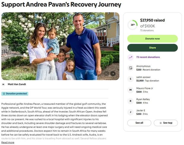 Foi, entretanto, criada uma página GoFundMe que já angariou mais de 23 mil euros. A página informa que Pavan sofreu «lesões significativas no ombro e nas costas, incluindo danos graves no ombro e fraturas em várias vértebras». A mesma fonte acrescenta que o atleta já foi submetido a pelo menos uma cirurgia e necessitará de mais cuidados médicos e procedimentos adicionais. Prevê-se que permaneça na África do Sul «durante muitas semanas antes de poder ser avaliado com segurança para viajar de volta para os EUA». Os fundos angariados destinam-se a cobrir os cuidados médicos prolongados e a apoiar Pavan, a mulher e três filhos.
