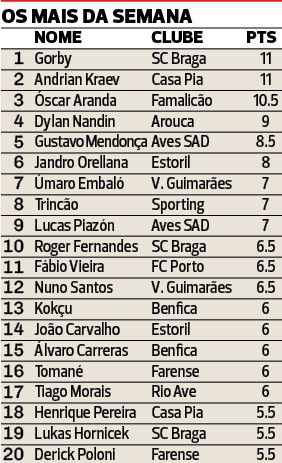 Dois jogadores partilham o topo semanal com registo tirado a papel químico — médio defensivo, autor do solitário golo da vitória, designado como o melhor em campo e com idêntica pontuação pela exibição produzida — pelo que o critério de mais minutos realizados desempatou a favor do bracarense Gorby, 22 anos, e O jogador mais valioso de A BOLA da jornada.