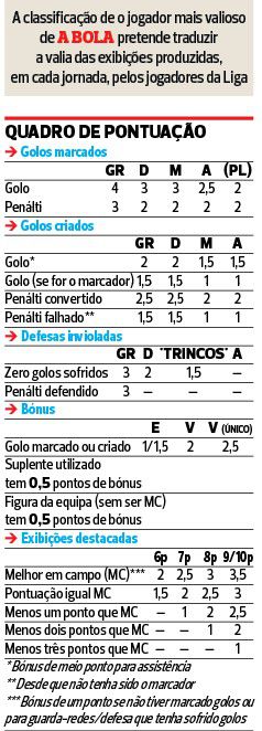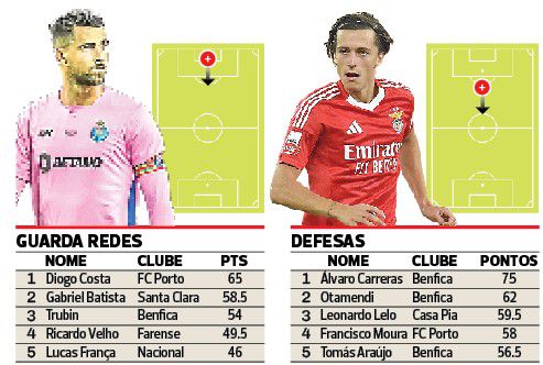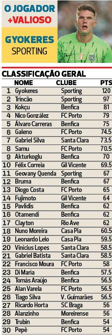 Com o campeonato a entrar no seu terço final Viktor Gyokeres — que cinco jornadas depois regressou aos golos na Vila das Aves — conserva a liderança da classificação de O jogador mais valioso de A BOLA da Liga mas viu ser reduzida a vantagem sobre Trincão, que tal como na semana anterior participou nos golos do empate leonino: cruzou no primeiro e abriu para Maxi Araújo assistir o sueco no segundo. Tal como se esperava desde a ida de Nico González para Inglaterra, Kokçu (belo passe para o segundo golo dos encarnados e conversão do penálti que fez o terceiro na Luz) subiu ao pódio e é o mais valioso dos médios, rendendo o espanhol que comandava a tabela dos centrocampistas há 14 jornadas!