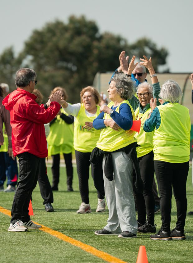 À medida que o ponteiro pequeno e grande do relógio caminhavam ao mesmo ritmo para os braços dos números 10 e 12, respetivamente, as imediações do campo do Santoantoniense ganhavam vida. Dezenas de participantes com idade superior a 50 anos reuniam-se à junto ao relvado à espera de luz verde para iniciar um treino da modalidade desenhada entre limites físicos desta faixa etária.