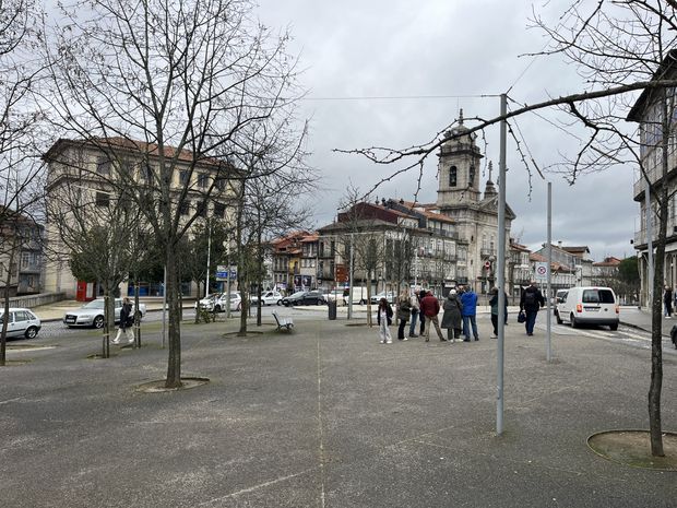 Ao redor da praça, numa manhã fria e de chuve leve, viram-se mesas ocupadas e muitos jornais abertos. A animação tinha mudado de forma, mas não desaparecido. Pelo chão, sobretudo em zonas de passagem na avenida em frente ao D. Afonso Henriques, permaneciam vestígios claros da celebração, como confettis brancos esquecidos nas ruas.