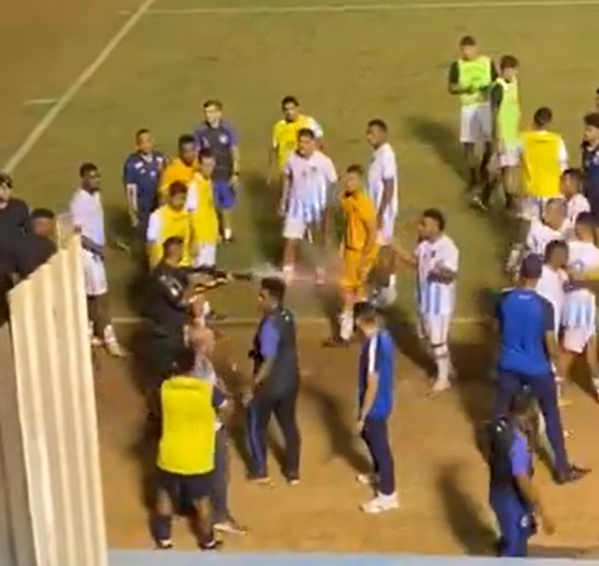 O futebol brasileiro proporcionou uma cena chocante na noite de quarta-feira, quando um polícia disparou uma bala de borracha sobre Ramón Souza, guarda-redes do Grêmio Anápolis, que, entretanto, reagiu à situação.