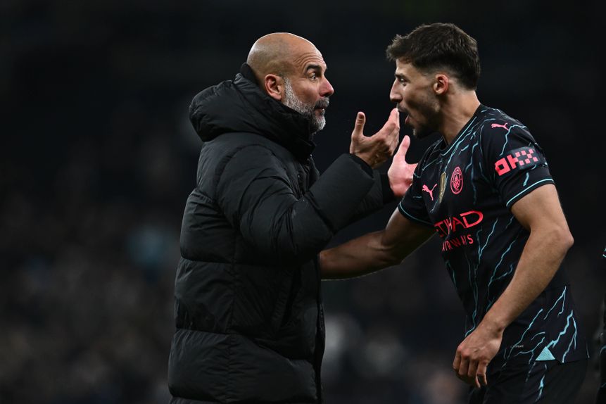 Pep Guardiola e Rúben Dias protagonizaram um momento, na passada sexta-feira, no fim do jogo do Manchester City contra o Tottenham, que está a dar que falar.