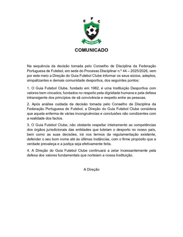 «Após análise cuidada» desta decisão do CD, pode ler-se, «a direção do Guia Futebol Clube considera que aquela enferma de várias incongruências e conclusões não condizentes com a realidade dos factos».