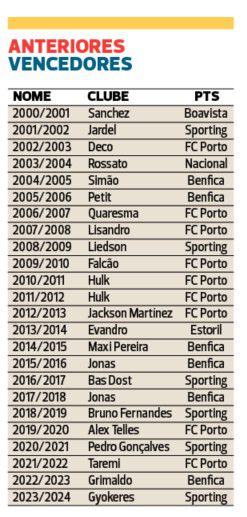O vendaval futebolístico que a contratação de Viktor Gyokeres, 26 anos, e de novo O jogador mais valioso de A BOLA da Liga, produziu no futebol português acentuou-se esta temporada, com o sueco a conseguir a mais alta pontuação dos 25 anos deste prémio — 210,5 pontos face aos 197 de Jonas em 2015/16 — acrescentando ainda a mais dilatada vantagem sobre o 2.º classificado (81 pontos). O artilheiro adquirido no verão de 2023 ao Coventry do segundo escalão inglês por 20 milhões de euros igualou ainda o feito até aqui só alcançado por Hulk, também vencedor em épocas sucessivas (2010/11 e 2011/12) e fundamental nesses dois títulos conquistados pelos dragões.