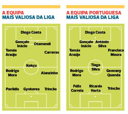 O onze mais valioso da Liga inclui cinco portugueses, com domínio dos rivais da Segunda Circular (cinco águias e três leões) e contempla ainda dois dragões (um dos quais o estreante Rodrigo Mora) e, surpreendentemente ou talvez não, o médio criativo do Moreirense, Alanzinho, a única exceção à hegemonia dos três grandes.