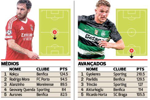Tirando partido da saída em janeiro de Nico González para o Manchester City – o médio portista liderou o setor ao longo de 14 jornadas e ausente desde a ronda 19 ainda terminou no 23.º lugar geral! –, Orkun Kokçu atingiu o topo na jornada 23 e foi o médio mais valioso da Liga. Indispensável para Roger Schmidt e Bruno Lage, o turco só falhou um jogo (acumulação de amarelos) e marcou por sete vezes (quatro com remates de fora da área), destacando-se na construção de golos ao participar na criação de 24 (sete assistências). Rodrigo Mora e Alanzinho partilham o pódio.