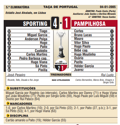 Foi, pois, há muito tempo. Ninguém que esteve nesse Sporting-Pampilhosa de janeiro de 2005, da Taça de Portugal, continua a jogar. Ricardo Pereira e Tiago Ferreira são agora treinadores, tal como Sá Pinto, Custódio e Rui Jorge. Hugo Viana é diretor desportivo do Sporting. João Moutinho é, pois, caso único. Em 2024/2025, por exemplo, só quatro jogadores são mais velhos na Liga: Nenê (Aves SAD), José Fonte (Casa Pia), Guillermo Ochoa (Aves SAD), Rúben Fernandes (Gil Vicente) e Luís Rocha (Santa Clara). E nenhum se estreara ainda no principal campeonato português.