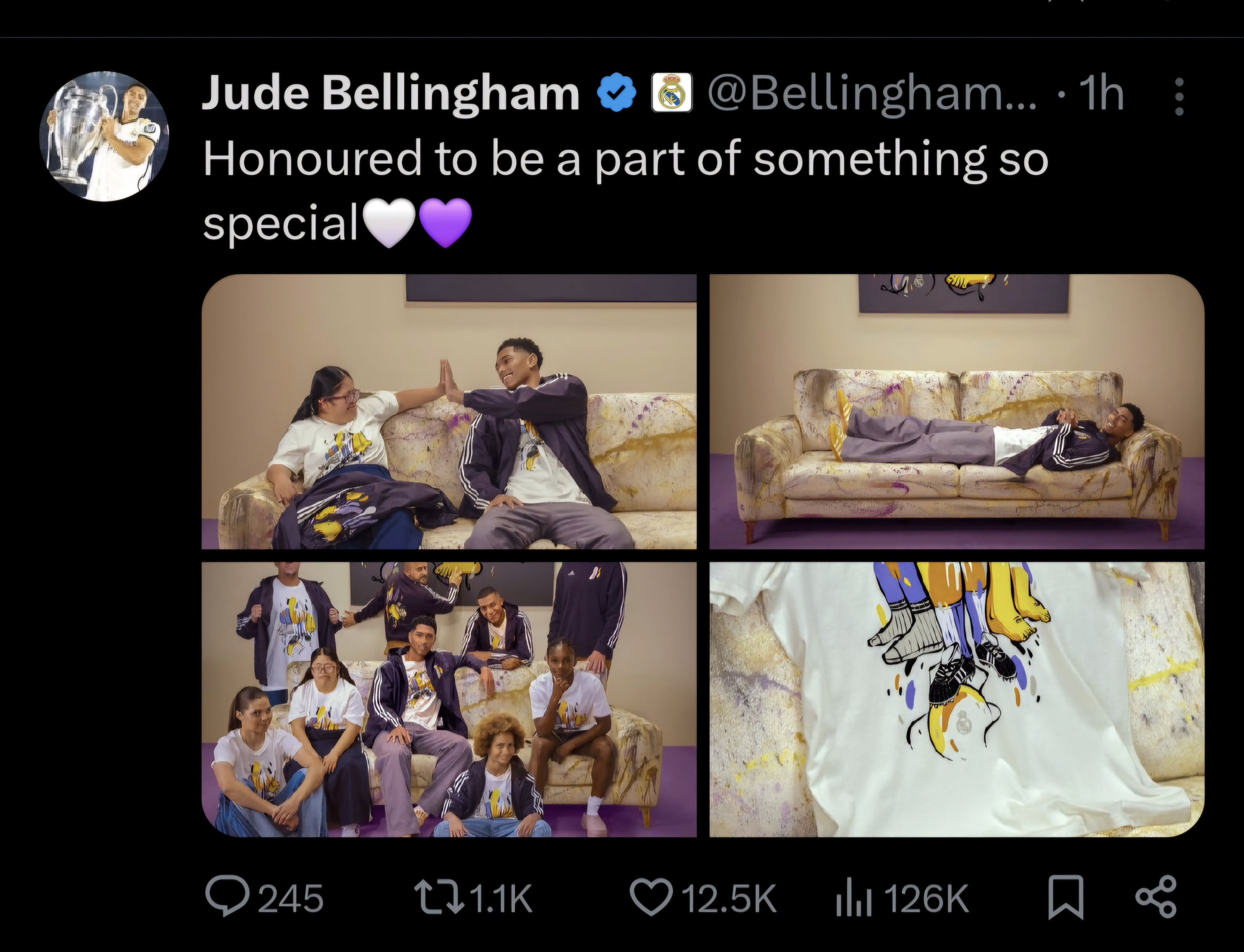 A questão é que, às 10.19 horas, Jude Bellingham fez uma publicação na sua conta no X com a mesma fotografia - e outras da campanha -, sendo que, nesta versão, Mbappé está presente.