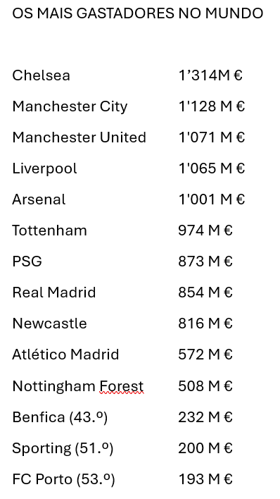 Arne Slot queixava-se em vésperas do jogo com o Liverpool de que os jornalistas só questionam as verbas que o clube gastou para construir o atual plantel, mas não têm dado grande interesse às vendas efetuadas pelo emblema do Norte de Inglaterra. Frase que torna ainda mais relevante o relatório elaborado pelo Observatório do Futebol CIES e nos mostra que o Chelsea é o emblema no mundo que mais gatou para ter o plantel que tem: 1,314 mil milhões de euros!