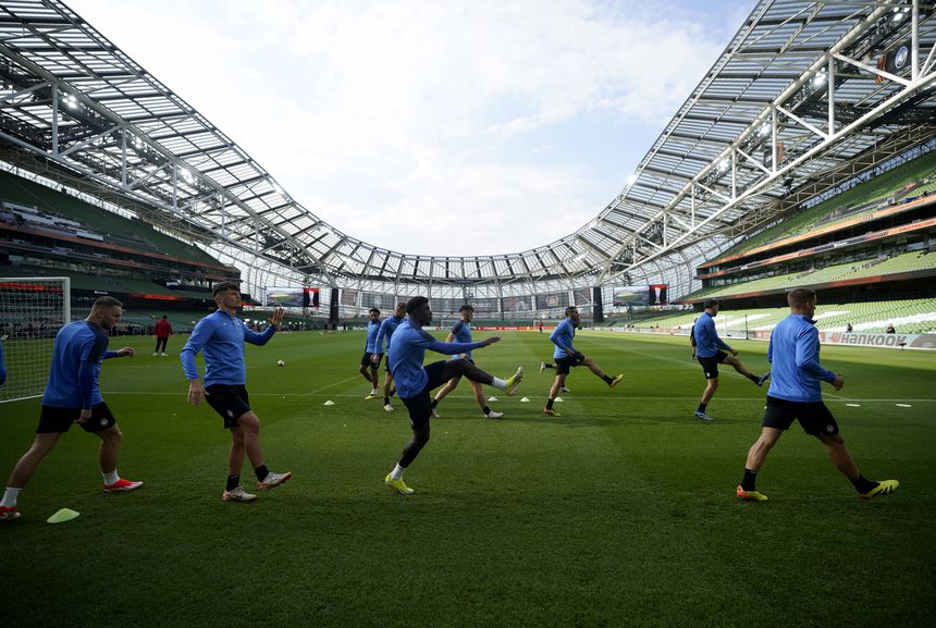 Treino da Atalanta no Estádio Aviva, que esta quarta-feira (20 h) recebe final da Liga Europa; foto Niall Carson/IMAGO