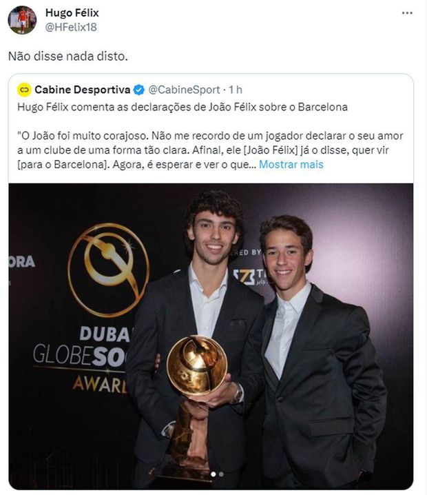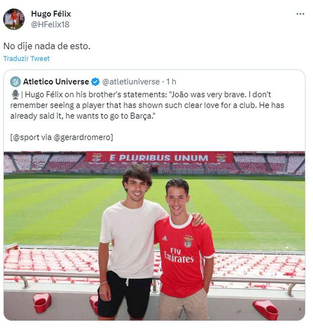 «O João foi muito corajoso. Não me recordo de um jogador declarar o seu amor a um clube de uma forma tão clara. Afinal, ele [João Félix] já o disse, quer ir [para o Barcelona]. Agora é esperar e ver o que decidem os responsáveis do Atlético de Madrid e do Barcelona», foram as palavras atribuídas ao jogador, entretanto desmentidas pelo próprio.