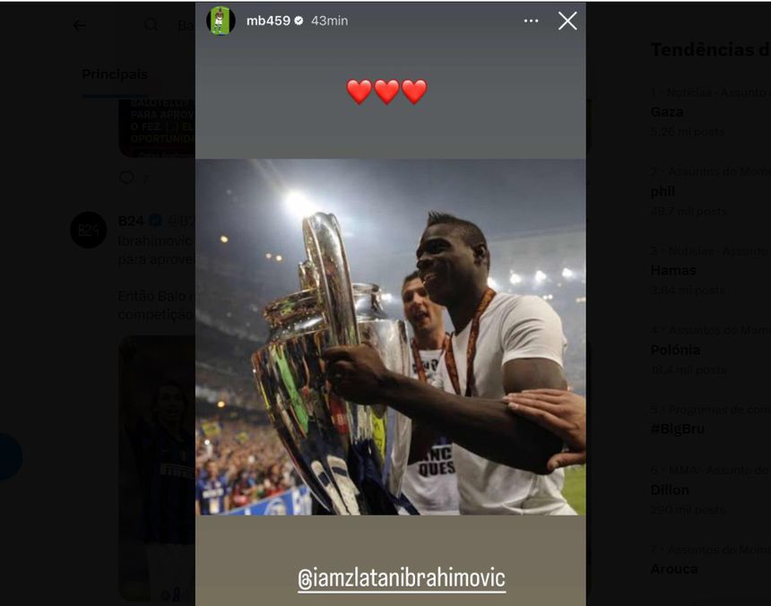 Balotelli, que é agora companheiro de Nani nos turcos do Adana Demirspor, não tardou a responder ao sueco. Sem palavras. Bastou uma imagem, em que Balotelli segurava a Liga dos Campeões conquistada ao serviço do Inter em 2012, e na qual identificou... Ibrahimovic, que nunca conseguiu conquistar tal troféu na longa carreira.