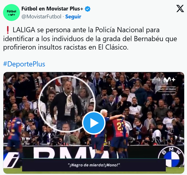 As imagens de televisão do Fútbol en Movistar Plus+ ‘apanharam’ dois dos adeptos que proferiram insultos racistas a Lamine Yamal no clássico da 11.ª jornada da La Liga, em que o Barcelona goleou o Real Madrid, por 4-0, no Bernabéu. Através das imagens partilhadas pela estação espanhola são percetíveis os insultos ao internacional espanhol.